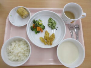 今日の給食は、【ごはん、鶏ささ身のカレースティック、ブロッコリーと人参のバター煮、のり塩こふき芋、コーンスープ、バナナ】でした。
