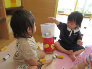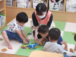 積み重ねてみたり、転がしてみたり、色々な遊び方で楽しんでいるひまわり組さんです。