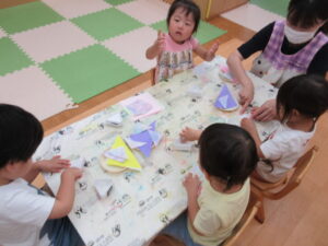 そら組は七夕飾りの三角つなぎをしました。真剣に取り組み、ながく繋げられたのを保育者に見せていました。