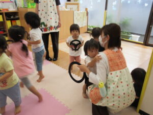 その後、そら組は英語でも使う輪っかやハンドルを使って、ゲームをしました。部屋の全体にニャッキやミッキー、