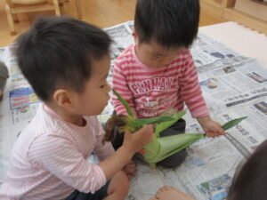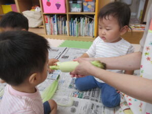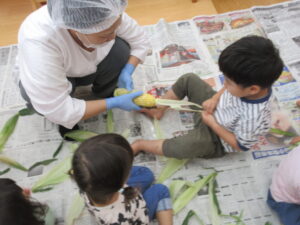 今日は食育でとうもろこしの皮むきをしました♪