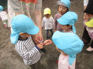 公園では、大きなダンゴムシを見つけて、