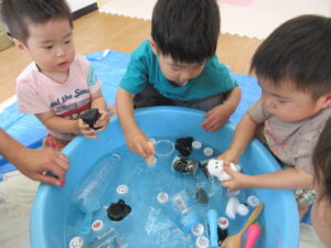 今日はお外が暑すぎるため、お部屋の中で、タライの水に玩具を浮かべて遊びました。