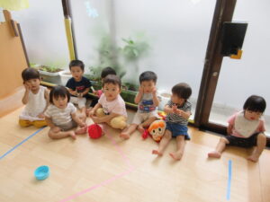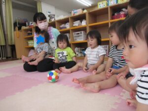 先生からのボールもしっかりキャッチ♬みんなボールを転がすのも上手です。