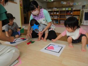 四角、丸、三角など同じ形を探して合わせるゲームを楽しみました✨