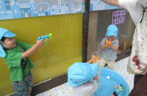 「シュシュー!!」と友達と水鉄砲を掛け合う真似をして楽しんでいますよ。