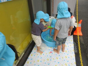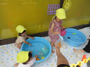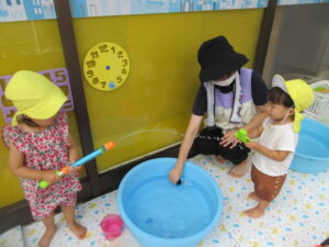 お友だちや保育士に水をかけて楽しそうにしていました。