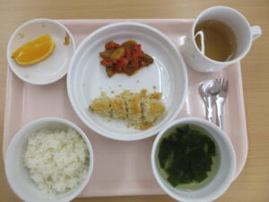 今日の給食は、【ごはん、さわらのカツレツ風、夏野菜のラタトゥイユ、コンソメスープ(小松菜、えのき)、オレンジ】
