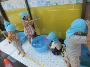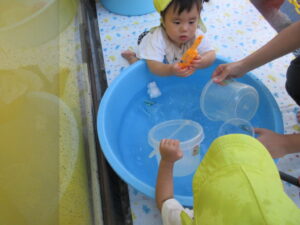 そら組さんも今日は大きな水鉄砲に夢中になって遊んでいました♪