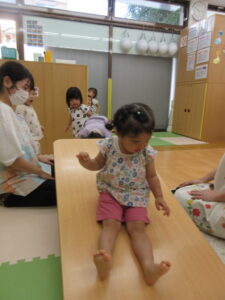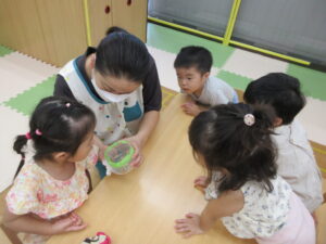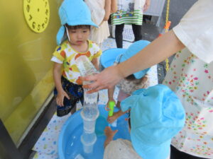 今日は、午前おやつを食べた後はお部屋で遊び、交代で水遊びもしました。