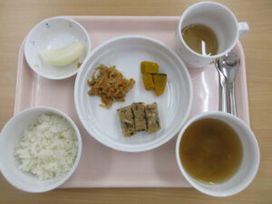 今日の給食は、【ごはん、ひじき入り鶏のつくね風焼き、切干し大根の煮物、ゆでかぼちゃ、みそ汁(なす、玉ねぎ)、なし】でした。