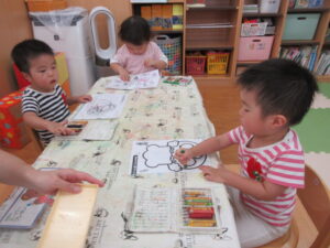 室内では食べ物カードを動物さんのお口に食べさせてあげたり・・・