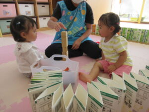 今か今かと保育士が積み終わるのを待機している姿が可愛らしいです♪