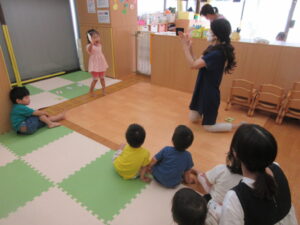 ひまわりぐみさんは朝おやつを食べながら緊張していましたが、先生の「ハロー」の声で笑顔が見られました。