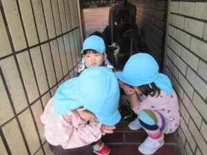 保育者が「お散歩にいこう♪」と子どもたちに伝えると「え!?さんぽにいくの?」「どこにいくの?」と