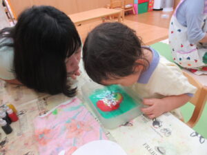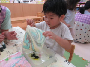 室内に戻ってからは製作をしました。マーブリング技法を使ってみました。