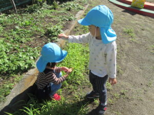 草を集めて「みてー」と保育者にアピールしていました。髪飾りのように帽子に