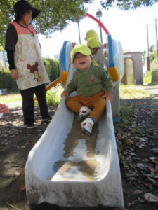 公園では昨日、雨だったのでぞうさん滑り台が濡れていて、教えてくれました。