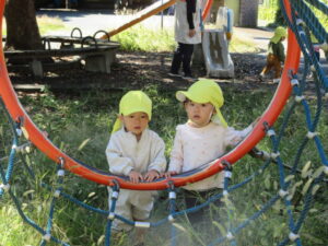 そら組が幼児公園に行き、草や砂場、ブランコをして遊びました。