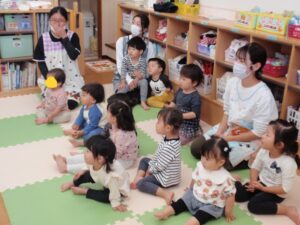 保育者の出し物では、ひよこさんや、カメさん、スズメさんのかくれんぼをエプロンシアターで行いました。