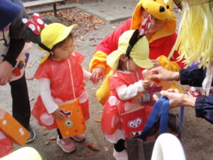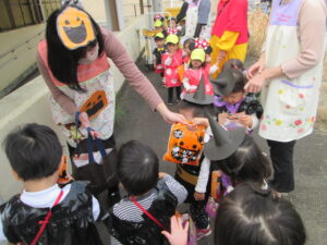 突然の登場に少しドキドキしてしまう子どもたちでしたが、「トリックオアトリート!」と言ってお菓子を貰うことができました✨