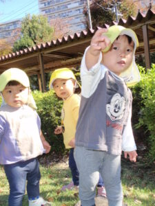 「どんぐりぃー」と嬉しそうに保育者に見せてくれたり、両手いっぱいに拾い集めていたりと楽しんでいました。