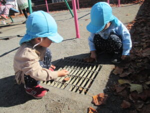 公園には落ち葉が沢山落ちていて落ち葉を拾い落ち葉吹雪をしたり公園にあるありとあらゆる穴にいれてみたりと楽しんでいました。