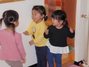 登園する時に「せんせー、おはよ」と元気に挨拶してくれるお友だち、室内にも元気な声が響きわたりました。
