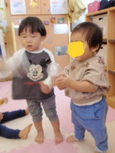 また、ペットボトルでどんぐりマラカスを作り昼食前には大きな音を鳴らして喜んでいました。