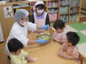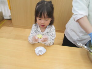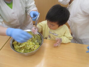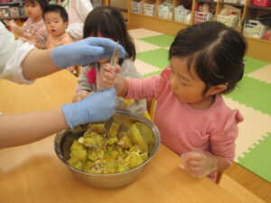 今日そら組さんは給食の先生とスイートポテト作りをしました。