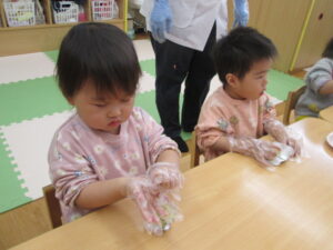 うさぎの形にしたい、ハートやくまを作りたい、それぞれ作りたい形を口に出していました。
