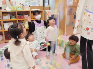 ボール遊びでは、カゴにたくさん集めたボールを一気にひっくり返して大喜び!
