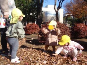 枯れ葉もたくさん落ちていて、踏んで音を楽しんだり、葉っぱを降らせて「キャー(>w<)」と喜んでいました。