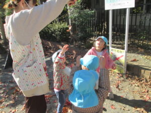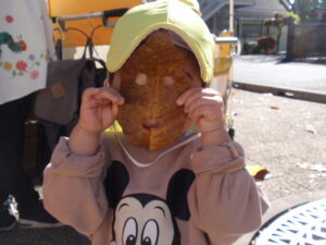 ひまわり組さんはあいぽっく周辺で見つけた大きな落ち葉で葉っぱのお面を作って楽しみました☺