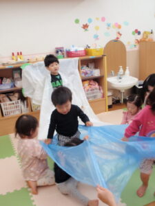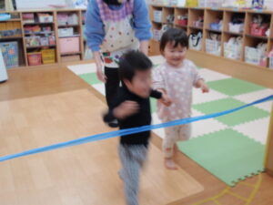 そら組さんは、運動会のようにゴールひもを用意しみんなで遊びました。