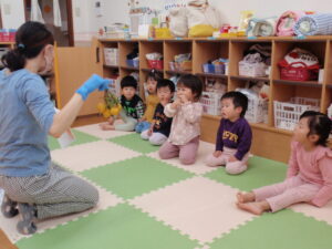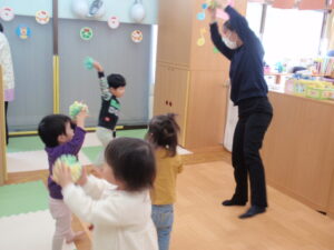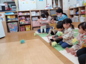 音楽に合わせて体を動かしたり、楽器を鳴らしたり、スポンジボールを使ってみんな楽しんでいました♪