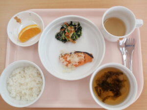 今日の給食は、【ごはん、鮭の玉ねぎ塩レモン焼き、ほうれん草とえのきの納豆和え、すまし汁(かぶ、かぶの葉)、オレンジ】でした。