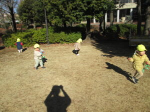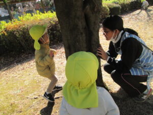 その後は風の強さにも負けず、枯れ葉遊びや、かくれんぼをして笑顔いっぱい遊びました。