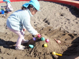 砂を入れたバケツをひっくり返してケーキを作ったりと、皆で想像を膨らまして遊んでいました。