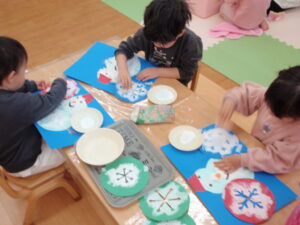 そら組は周辺散歩後、雪だるまや雪の結晶の製作をしました。