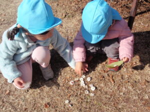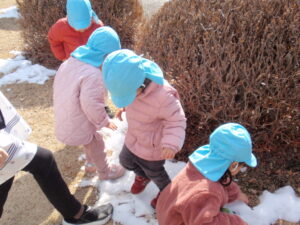 そら組さんは、日陰に残っているた雪を見つけて、触ったり、踏んだりと、雪の感触を楽しみました❄