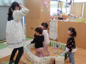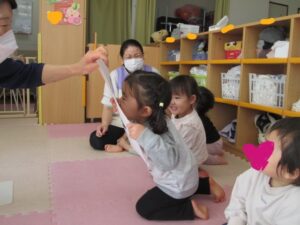 そら組さんの英語の後は、保育者が鬼になって鬼退治していました。