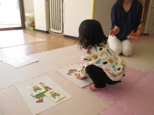 動物カードを取りに行きました。引いたカードで同じ絵を見つけると「あ!」と教えてくれた子どもたち。