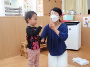 そら組は何歳ですか?の質問に「two(three)」と答えたり、指で伝えてくれました。