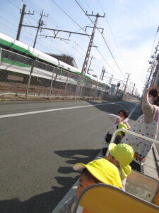 また電車の踏切の音で「でんしゃ!」とキョロキョロしていた子どもたち。