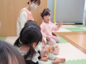 「幸せなら手をたたこう」の曲にあわせてタンバリンを鳴らしたり、ジャンプしたり、