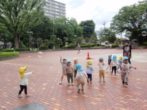 朝にシャボン玉液を保育者が詰め替えていたのを見ていた子どもが「シャボンだまは?」と話してくれました。