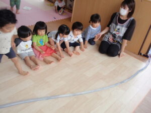 保育士が「水遊びの準備してくるね」と準備を始めると子どもたちも興味津々!!
