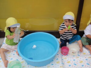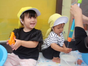水鉄砲をしたり、スプーンを使って水を移し替えたり、、思い思いに楽しむ姿見られましたよ♡