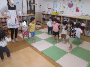 お部屋の中で体操や、水遊びをして過ごしました。